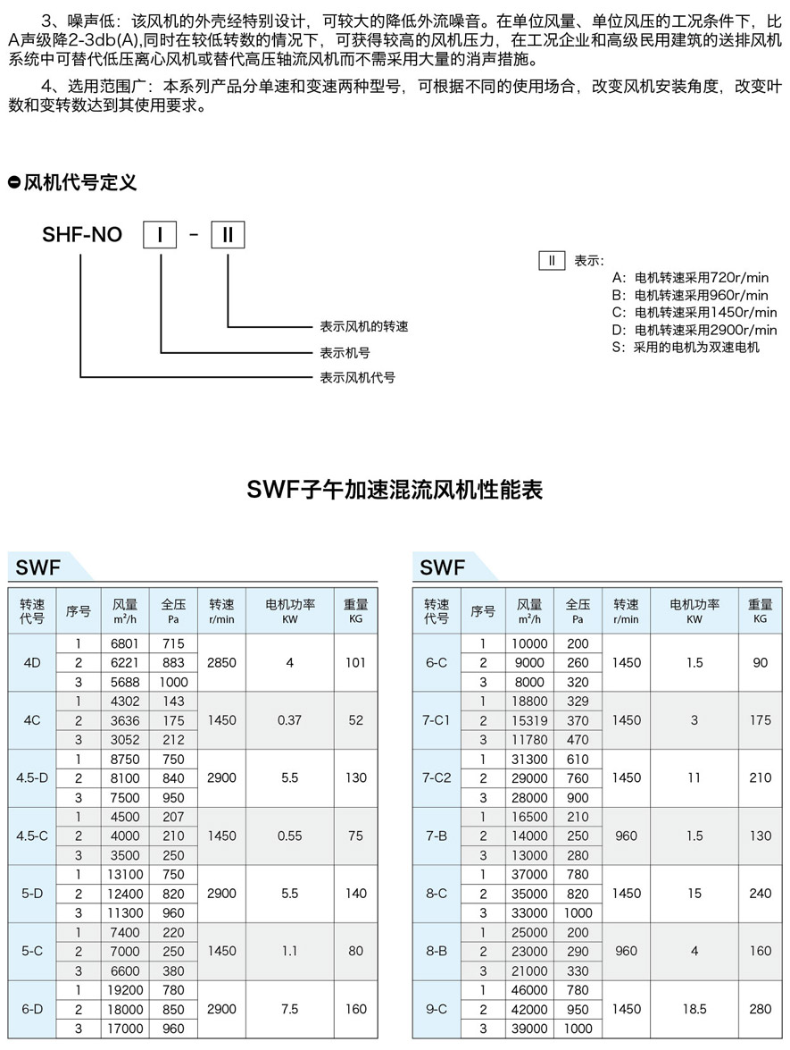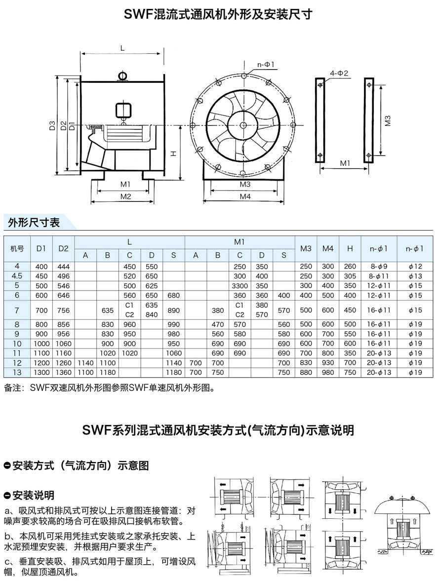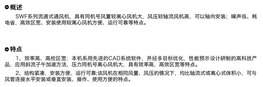 SWF系列流通式通風(fēng)機(jī),具有同機(jī)號風(fēng)置較離心風(fēng)機(jī)大,風(fēng)壓較軸流風(fēng)機(jī)高,可以軸向安裝;