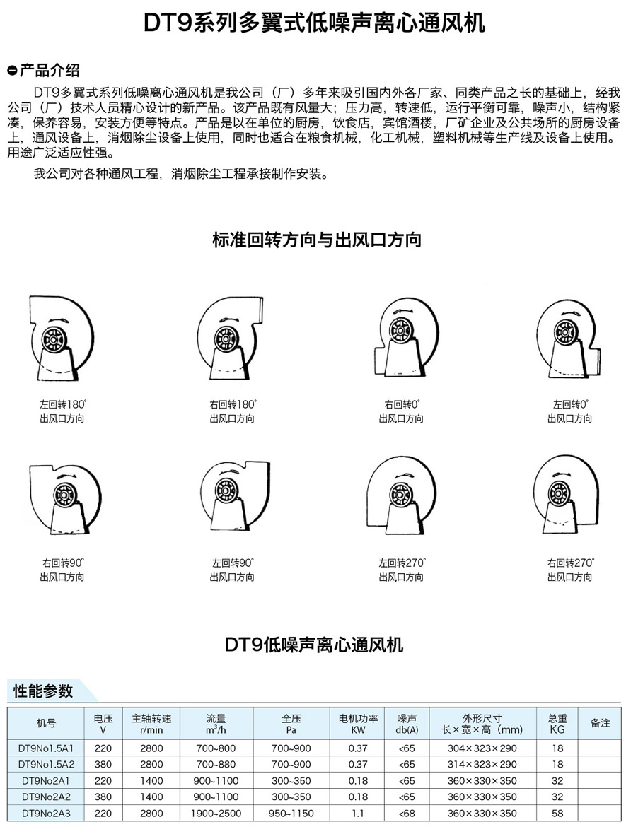 DT9多翼式系列低噪離心通風(fēng)機(jī)是我公司(廠(chǎng))多年來(lái)吸引國(guó)內(nèi)外各廠(chǎng)家、同類(lèi)產(chǎn)品之長(zhǎng)的基礎(chǔ)上,經(jīng)我 公司(廠(chǎng))技術(shù)人員精心設(shè)計(jì)的新產(chǎn)品。
