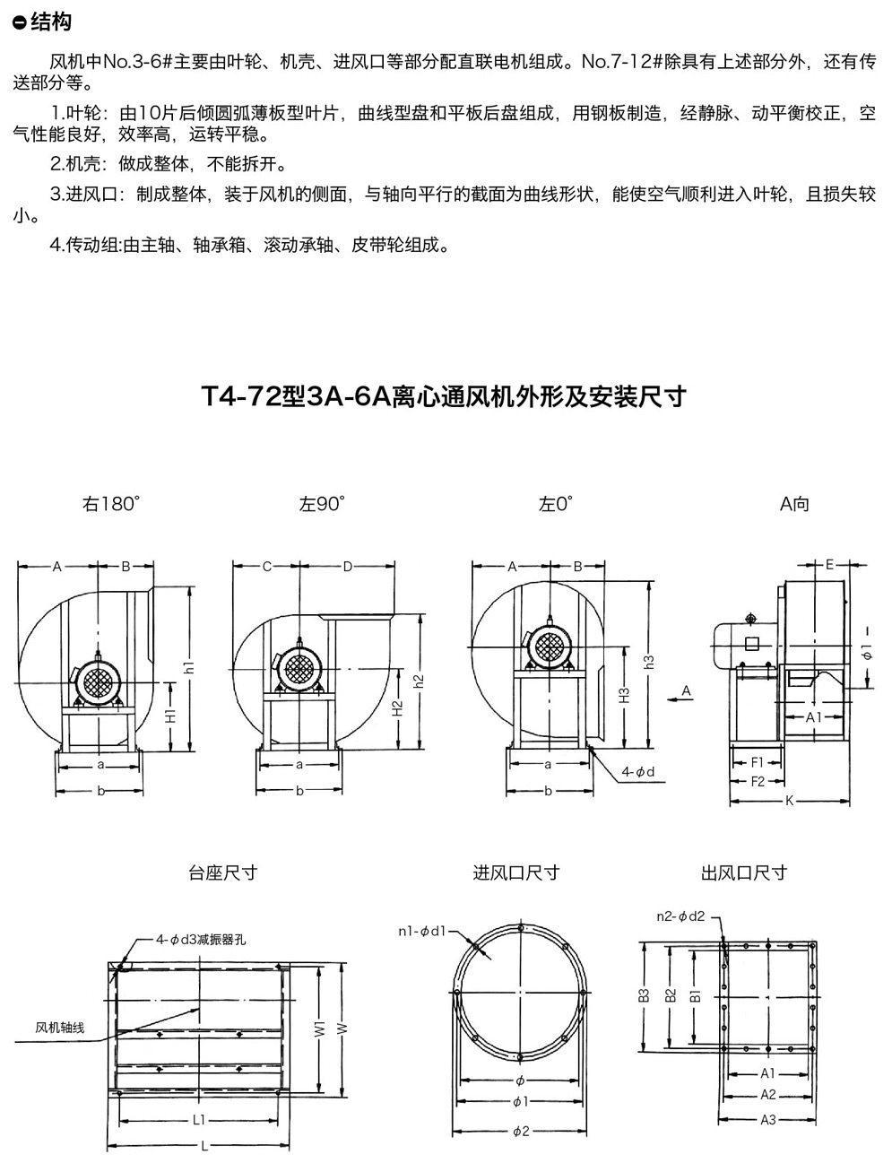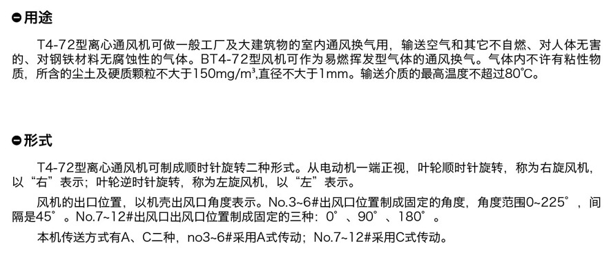 T4-72型離心通風(fēng)機(jī)可做一般工廠及大建筑物的室內(nèi)通風(fēng)換氣用,輸送空氣和其它不自燃、對人體無害 的、對鋼鐵材料無腐蝕性的氣體。BT4-72型風(fēng)機(jī)可作為易燃揮發(fā)型氣體的通風(fēng)換氣。氣體內(nèi)不許有粘性物 質(zhì),所含的塵土及硬質(zhì)顆粒不大于150mg/m3,直徑不大于1mm。輸送介質(zhì)的最高溫度不超過80°C。